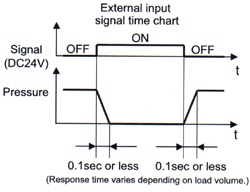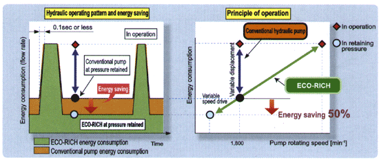 - Response equivalent to or higher than conventional variable displacement pump (Pressure retained operation at maximum flow rate:0.1sec or less)