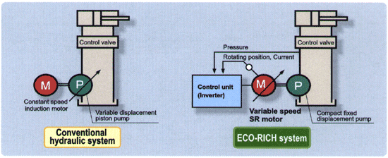 - Our original SR motor control unit of high efficiency and compact fixed-displacement pump are employed.